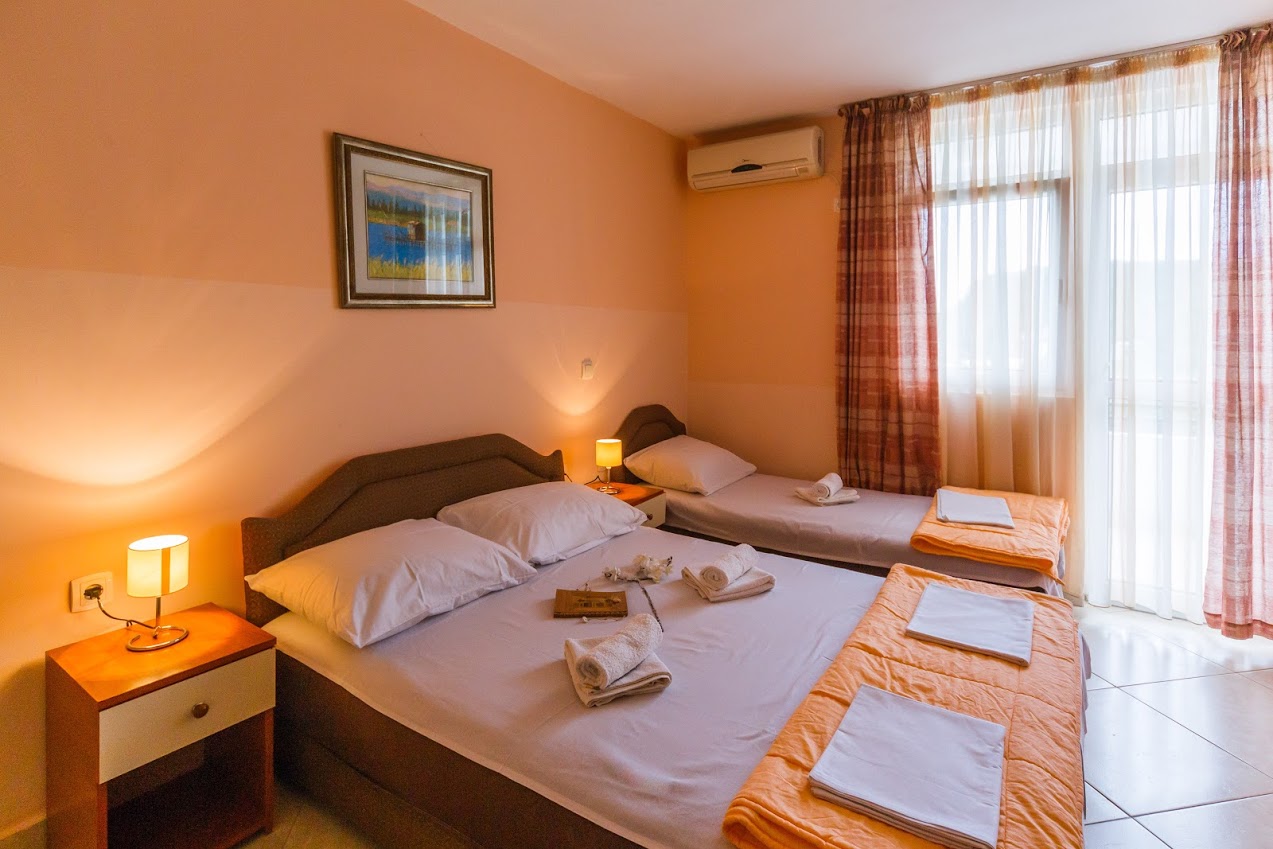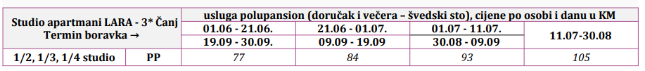 Usluge – Moderno opremljeni (1/2, 1/3, 1/4) posjeduju sopstvenu terasu, kupatilo, TV-kablovsku, WiFi, frižider, klimu, mini kuhinju sa komplet opremom. Objekat posjeduje lift. U sklopu objekta je moderno opremljen konforan restoran gde vas u prijatnom ambijentu očekuje kvalitetna usluga domaće hrane od ljubaznog i nasmijanog osoblja. Za trenutke opuštanja uz kafu i piće, neposredno uz restoran nalazi se ljetnja bašta sa malom igraonicom za djecu. Par puta u toku nedelje organizujemo dečije pozorišne predstave na kojima će djeca uživati uz likove svojih omiljenih crtaća.