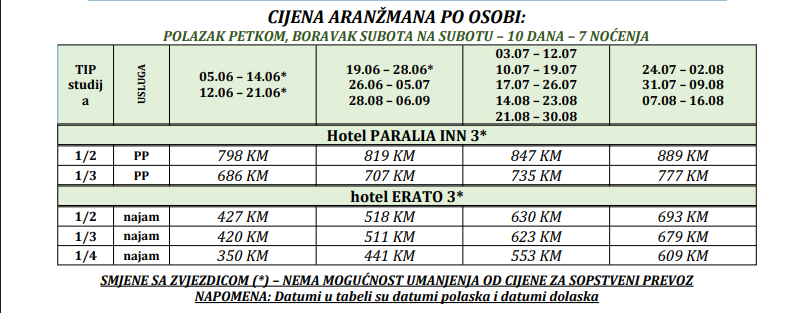 NAPOMENA: Za sopstveni prevoz umanjenje 120 KM po osobi, a djeca od 2 – 12 godina umanjenje 70 KM –